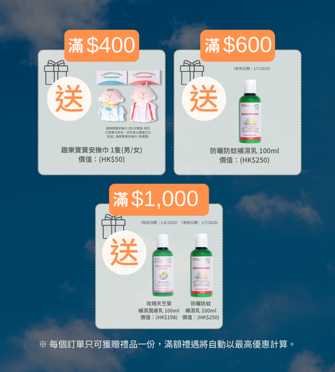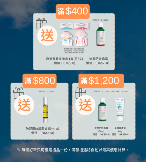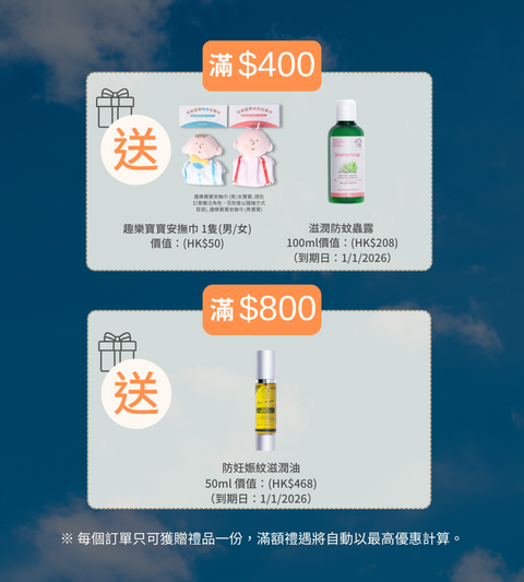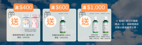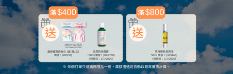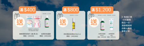 購買任何產品滿$400/ $800,可獲贈滿額禮遇1份。